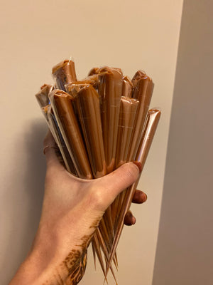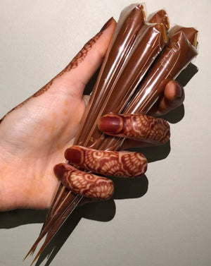 Leave your henna on for atleast 4-6 hours. Leaving henna on overnight is strongly recommended. Scrape off henna paste with Oil and avoid water for as long as possible for a rich deep stain. Clove heat also helps with achieving a dark stain. Stay Warm!